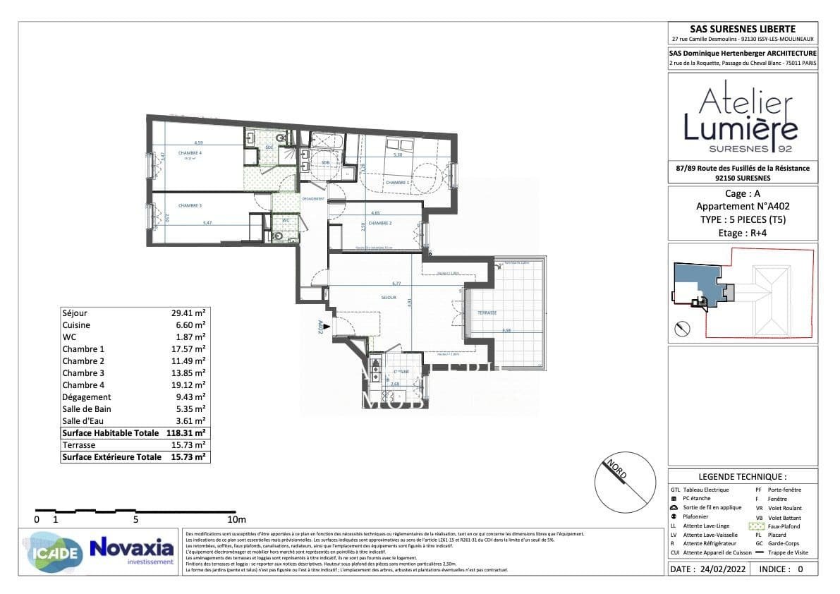 Cet appartement 5 pièces de 118,31 m² se compose d’un vaste séjour de 29,41 m² donnant accès à une terrasse de 15,73 m², d’une cuisine indépendante à aménager, de 4 chambres confortables, d’une salle de bain, d’une salle d’eau et de deux toilettes, dont un séparé.